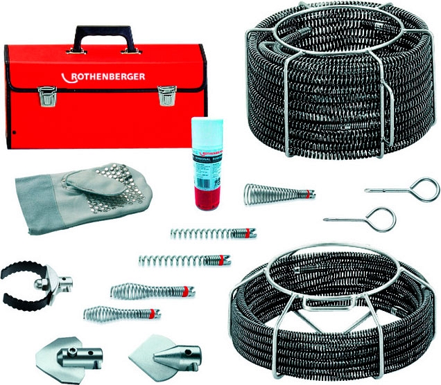 Набор прочистных спиралей и насадок Rothenberger Standard 16 мм (5/8")/22 мм (7/8") (Ротенбергер Стандарт 16 мм (5/8")/22 мм (7/8")) предназначен для электрических прочистных машин R 550 / 600 / 650 / 750 / 80, а также других производителей.