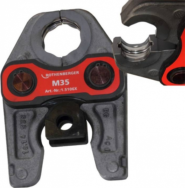 Пресс-клещи Rothenberger Standard M35 (Ротенбергер Стандарт М35) проверенного качества, ориентированные на пресс-фитинговые и трубные системы обжима медных, нержавеющих стальных труб и труб из цветных металлов Ø 35 мм различных производителей. Предназначены для аккумуляторных и электрических гидравлических радиальных прессов Rothenberger Romax 4000 / 3000 AC / AC Eco.