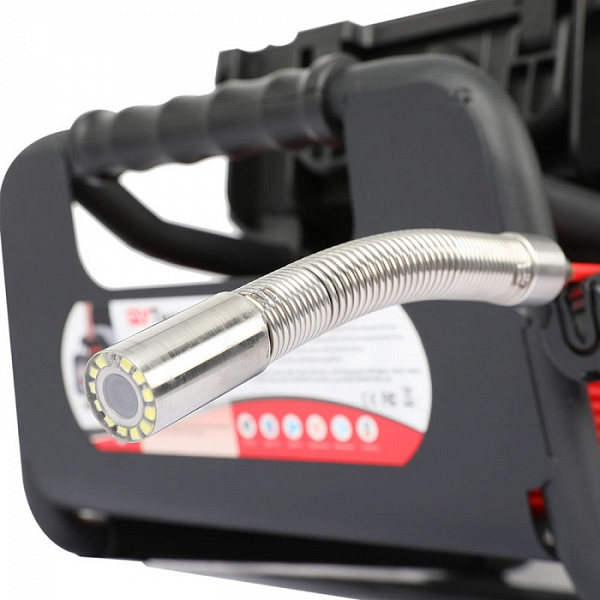 - Головка камеры Ø 21 × 45 мм и проталкиваемый кабель Ø 5,3 мм × 40 м из стекловолокна со счетчиком длины, подходящие для труб Ø 50 – 125 мм, длиной до 40 м