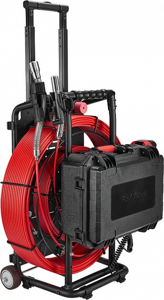 - Головка камеры Ø 29 × 50 мм и проталкиваемый кабель Ø 7,2 мм × 80 м из стекловолокна со счетчиком длины и системой торможения, подходящие для труб Ø 80 – 200 мм, длиной до 80 м